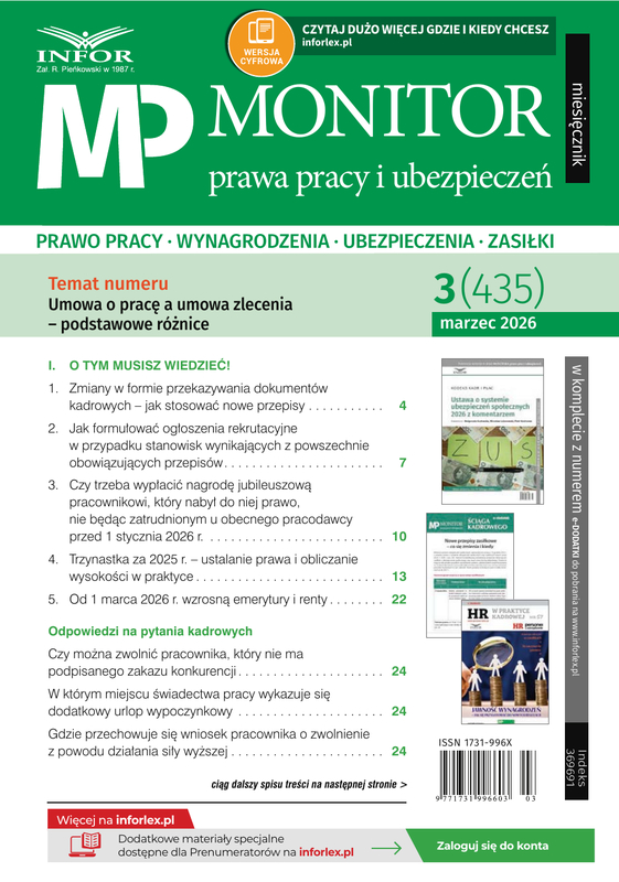 Monitor Prawa Pracy i Ubezpieczeń to dwutygodnik, w którym znajdziecie Państwo rozwiązania dotyczące m.in. czasu pracy, urlopów, naliczania składek, wypłaty wynagrodzeń i zasiłków.
