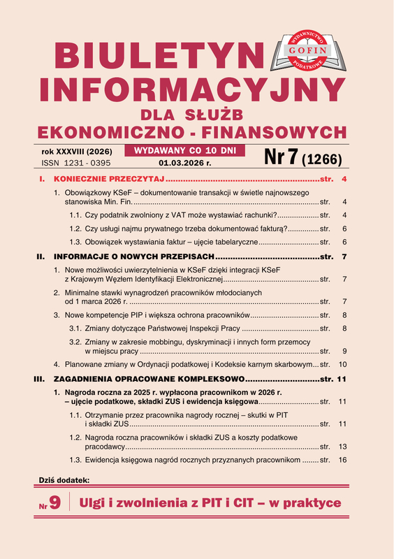 Biuletyn Informacyjny dla Służb Ekonomiczno-Finansowych - ukazuje się co 10 dni. W każdym numerze na 76 stronach wyjaśnia problemy związane ze stosowaniem w praktyce przepisów: o VAT, PIT, CIT, rachunkowości, z prawa pracy i ubezpieczeń społecznych. Podpowiada najlepsze rozwiązania. Podaje najważniejsze i najbardziej aktualne orzecznictwo sądów oraz interpretacje organów podatkowych. Każdy numer zawiera wiele odpowiedzi na pytania Czytelników, przykłady i praktyczne rozwiązania wraz z ewidencją księgową.