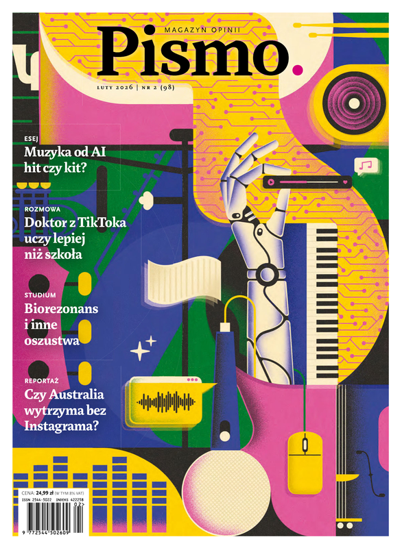 Maszynowo wygenerowane przeboje, które pojawiają się bez ostrzeżenia na naszych playlistach, to jeden z bardziej irytujących przejawów rozwoju sztucznej inteligencji. Co to zjawisko oznacza dla słuchaczy i słuchaczek, dla ludzkich artystów i artystek, a wreszcie dla całej branży? Odpowiedzi na to pytanie w naszym okładkowym tekście szuka dziennikarz muzyczny Jakub Knera. W lutowym numerze sprawdzamy też, jak australijskie nastolatki radzą sobie bez mediów społecznościowych, weryfikujemy wiarygodność biorezonansu i badania żywej kropli krwi, a także rozmawiamy z Doktorem z TikToka o tym, po co nam znajomość cyklu rozwojowego ślimaka.