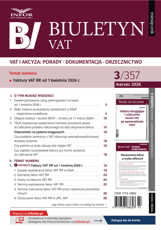 Biuletyn VAT to najobszerniejsze źródło wiedzy wskazujące gotowe rozwiązania rzeczywistych problemów podatkowych dla: księgowych, doradców podatkowych, przedsiębiorców, pracowników odpowiedzialnych za rozliczenie VAT i akcyzy. Pomaga rozliczać VAT i akcyzę zarówno w kraju jak i za granicą. Prezentuje różne stanowiska organów podatkowych ze wskazaniem rozwiązań prawidłowych i bezpiecznych dla podatnika. Wszystkie porady poparte są orzecznictwem krajowym i zagranicznym oraz odwołaniem do przepisów dyrektyw.