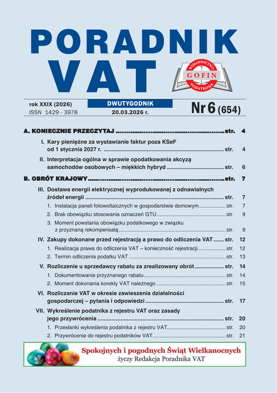 Poradnik VAT - dwutygodnik, który na 68 stronach wyjaśnia i podpowiada, jak w praktyce stosować skomplikowane przepisy podatku VAT. Prezentuje bieżące informacje na temat zmian w przepisach VAT i akcyzy wraz z komentarzami o ich skutkach dla podatników, publikuje interpretacje organów podatkowych oraz orzeczenia sądowe. Odpowiada na pytania Czytelników. Poradnik VAT to czasopismo dla służb finansowo-księgowych, doradców podatkowych, pracowników KAS, jak i przedsiębiorców.