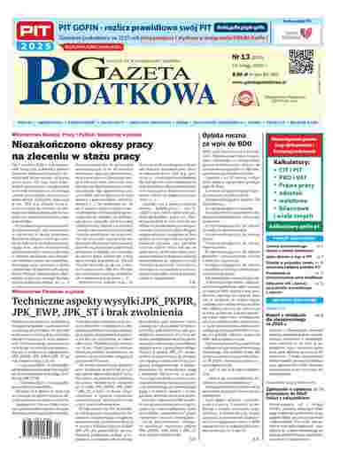 UKAZUJE SIĘ W PONIEDZIAŁKI I CZWARTKI Gazeta Podatkowa - ukazuje się w każdy poniedziałek i czwartek. To ŚWIETNE źródło informacji niezbędnych dla księgowych, kadrowców, przedsiębiorców i podatników. Zdecydowanie dominują w niej zagadnienia z zakresu podatków (VAT i podatku dochodowego), prawa pracy, ubezpieczeń społecznych i świadczeń ZUS oraz rachunkowości. Omawia probl...