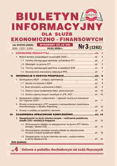 UKAZUJE SIĘ 1, 10 i 20 KAŻDEGO MIESIĄCA Biuletyn Informacyjny dla Służb Ekonomiczno-Finansowych - ukazuje się co 10 dni. W każdym numerze na 76 stronach wyjaśnia problemy związane ze stosowaniem w praktyce przepisów: o VAT, PIT, CIT, rachunkowości, z prawa pracy i ubezpieczeń społecznych. Podpowiada najlepsze rozwiązania. Podaje najważniejsze i najbardziej aktualne orzecz...