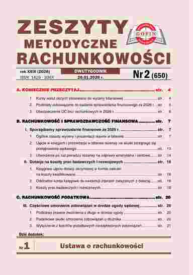 UKAZUJE SIĘ 1 i 20 KAŻDEGO MIESIĄCA Zeszyty Metodyczne Rachunkowości - dwutygodnik szczegółowo wyjaśnia problemy związane ze stosowaniem ustawy o rachunkowości oraz Krajowych Standardów Rachunkowości. Prezentuje i omawia na przykładach liczbowych ewidencję zdarzeń gospodarczych, wycenę aktywów i pasywów, sporządzanie sprawozdań finansowych oraz stosowanie MSR. Wskazuj...
